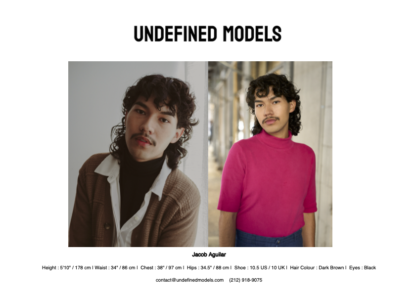 Jacob is an active member of the Model Alliance, helping pass the Fashion Workers’ Act into New York State Law in 2024. They collaborate with brands, businesses, and organizations to promote Latinx representation and inclusion within the Fashion and Entertainment industry.